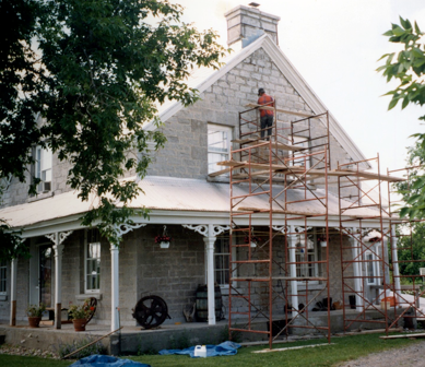 The lean-to “sunroom” on the south side of the house was renovated in 2000, with grey siding to match the limestone, and new windows more in keeping with those in the main house.
