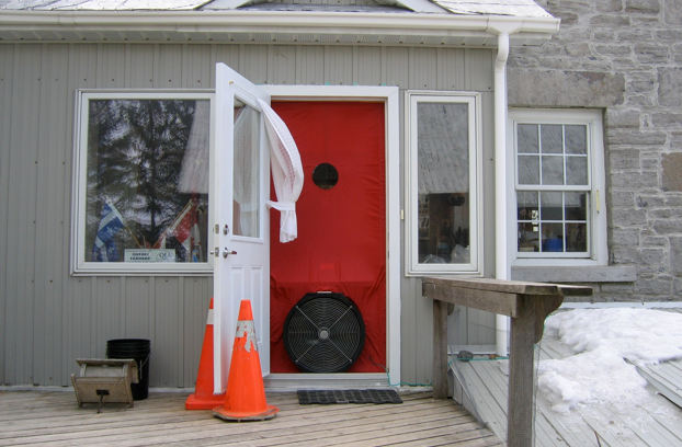 Photo March 2006: the energy audit. Blowing air out of the house to find out where the air is coming in. This is the entrance on the north (driveway) side, added in 1992.
